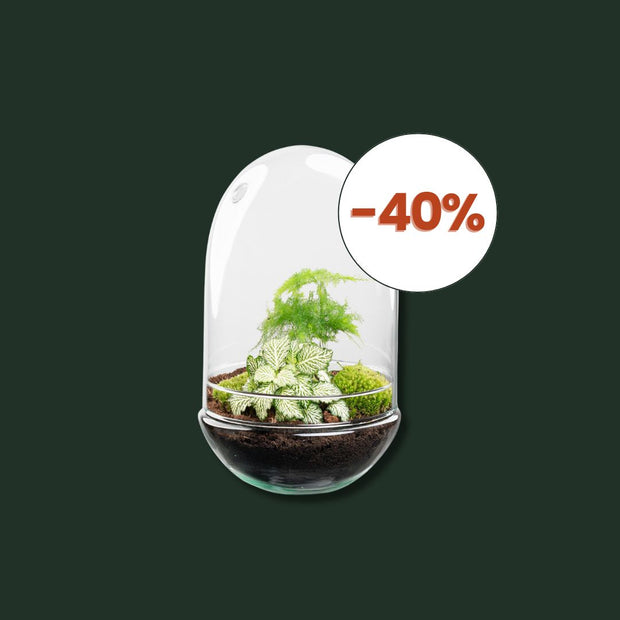 With a plant terrarium, you're not only bringing a special eye-catcher into your home, but also a piece of peace and nature that maintains itself. This mini-jungle in glass is perfect for anyone who loves greenery but lacks time or green thumbs. Thanks to the closed ecosystem, the terrarium mostly takes care of its own water and humidity. Watering is often only needed once or twice a year. This way, you can effortlessly enjoy vibrant greenery without the hassle. Place the terrarium in your living room, on your desk, or give it as a gift; it instantly adds atmosphere and freshness to any space. This way, you can enjoy greenery endlessly and worry-free at home or in the office. All the benefits, none of the burden! Add this terrarium to your cart and enjoy your own mini-ecosystem plant by tomorrow! What's in the plant terrarium package Our Do-It-Yourself (DIY) plant terrariums are delivered as a DIY kit. After receiving it, you can easily assemble your new green friend using the included 5-step plan. Egg XL terrarium- Ø 17.5 cm ↑ 30 cm Terrarium plants- Asparagus- Fittonia White Tiger Terrarium refill/starter kit size S/M- Fresh green cushion moss (2 pieces)- Terrarium potting soil (0.75 liters)- Clay pebbles (0.75 liters)- Activated charcoal (35 grams)- Terrarium step-by-step guide (Languages: DE, NL, EN, FR, IT, ES)- Terrarium care instructions It is recommended to open your plant terrarium for a few hours once a month.
