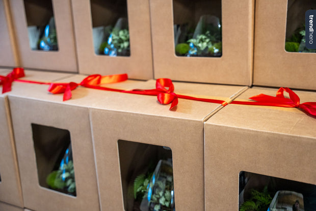 In unserer Pflanzenwerkstatt fertigen wir täglich Terrarien für große und kleine Unternehmen, verpackt als Weihnachtsgeschenke oder als Werbegeschenke für bestehende oder neue Kunden und Geschäftspartner. Wir versenden sie als DIY-Paket oder Fertigpaket direkt an den Kunden.
