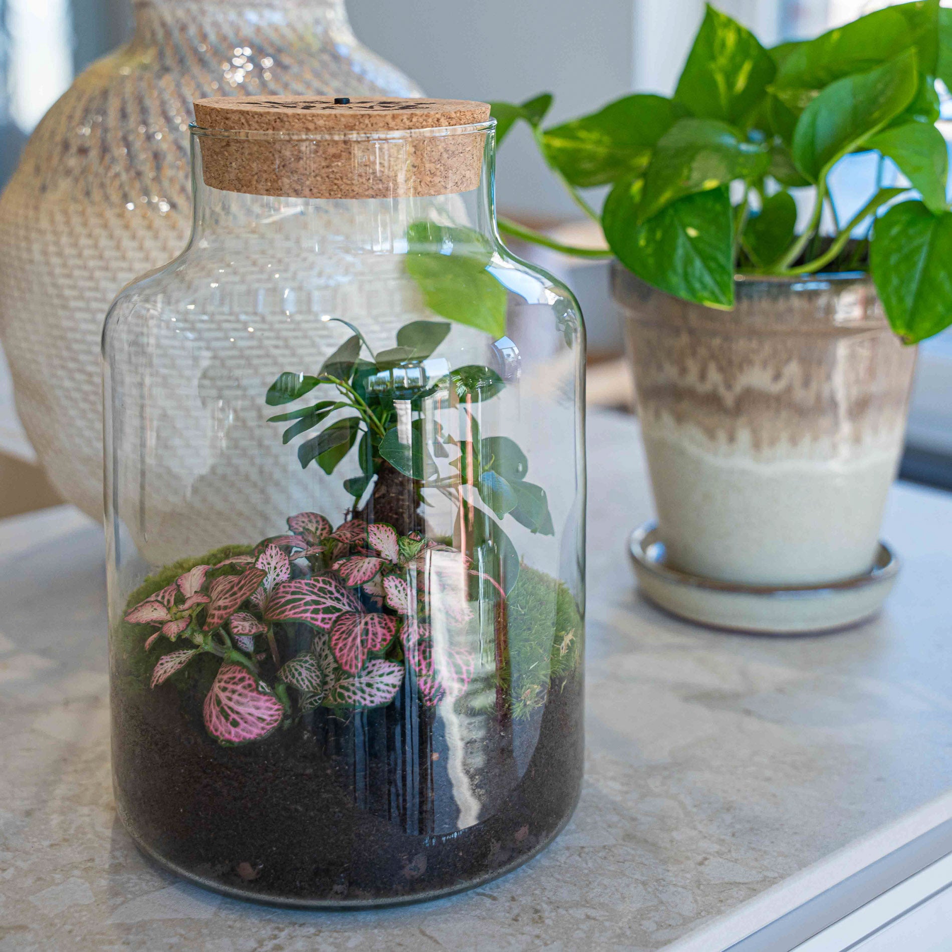 Mit diesem Pflanzenterrarium verschenkst du nicht nur einen einzigartigen Blickfang, sondern auch ein Stück Ruhe und Natur für jeden Tag. Dieser Mini-Dschungel im Glas ist perfekt für alle, die Pflanzen lieben, aber wenig Zeit oder keinen grünen Daumen haben. Dank des geschlossenen Ökosystems reguliert das Terrarium Wasser und Luftfeuchtigkeit weitgehend selbst, sodass nur ein- bis zweimal im Jahr gegossen werden muss. Ein schönes, pflegeleichtes Geschenk, das lange Freude bereitet.