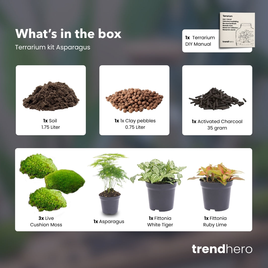 Asparagus - DIY Flaschengarten Starter- & Nachfüllset mit 3 Terrarienpflanzen