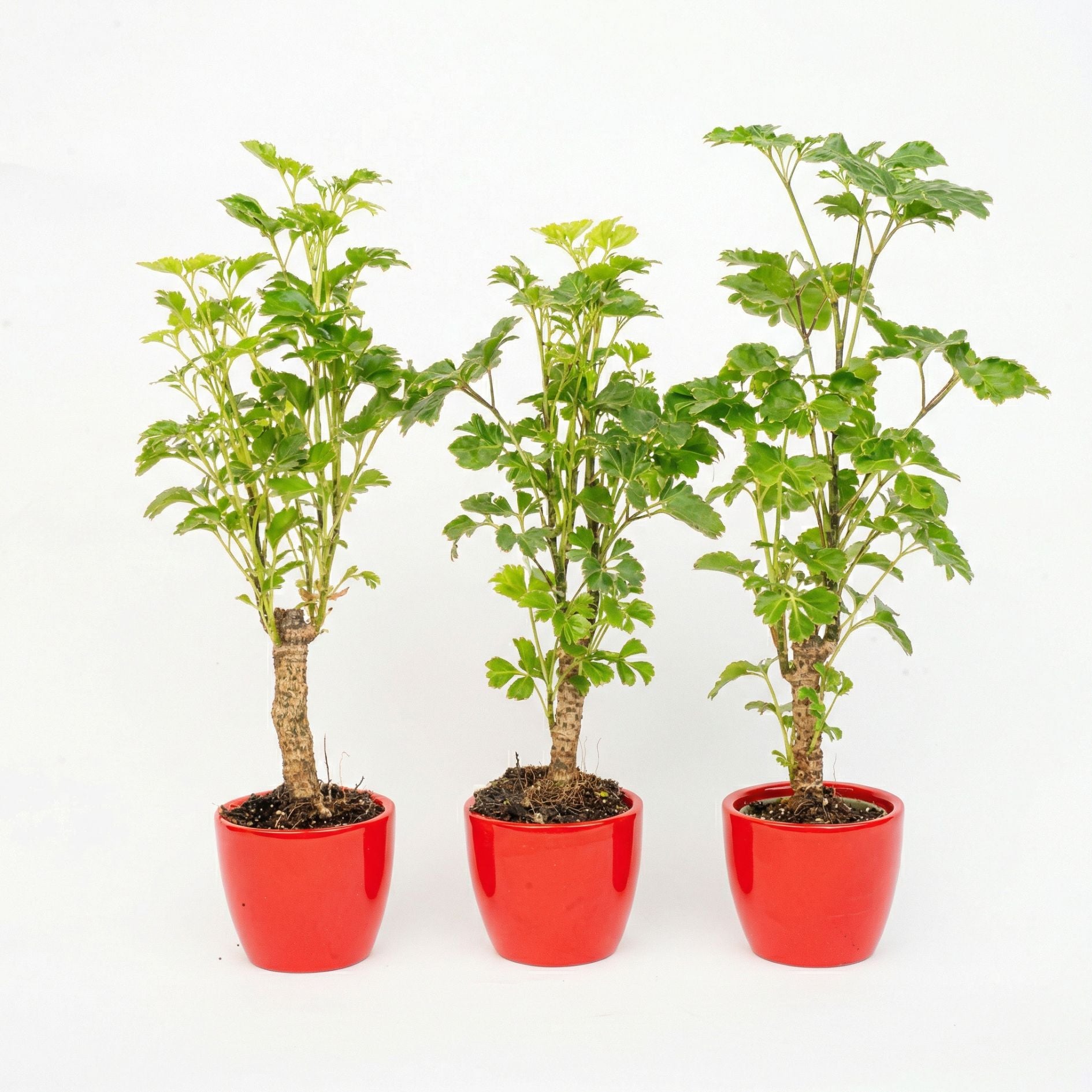 This elegant plant set brings softness, movement and natural texture to any space - from shelves to desktops. Each set includes three live Polyscias Balfouriana ‘Butterfly’ plants in red ceramic mini pots (Ø6 cm x H6 cm), each growing to an approximate height of 27 cm.