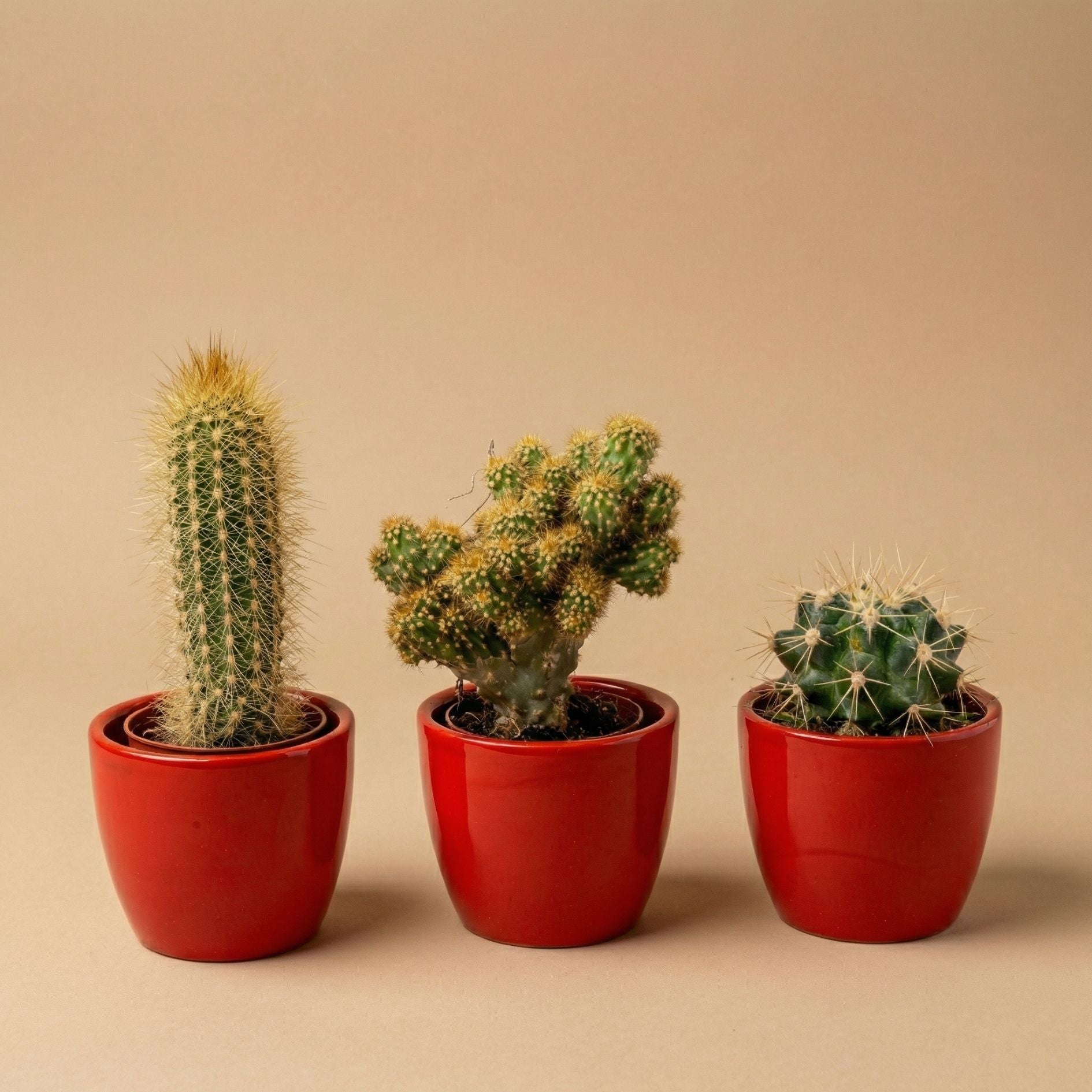 Add a bold, spiky touch to your interior with the Cactus Set of 3 + Mini Pot Red. This compact set brings character and texture to any space – from shelves to desktops. Each set includes three live cacti in red ceramic mini pots (Ø6 cm x H6 cm).