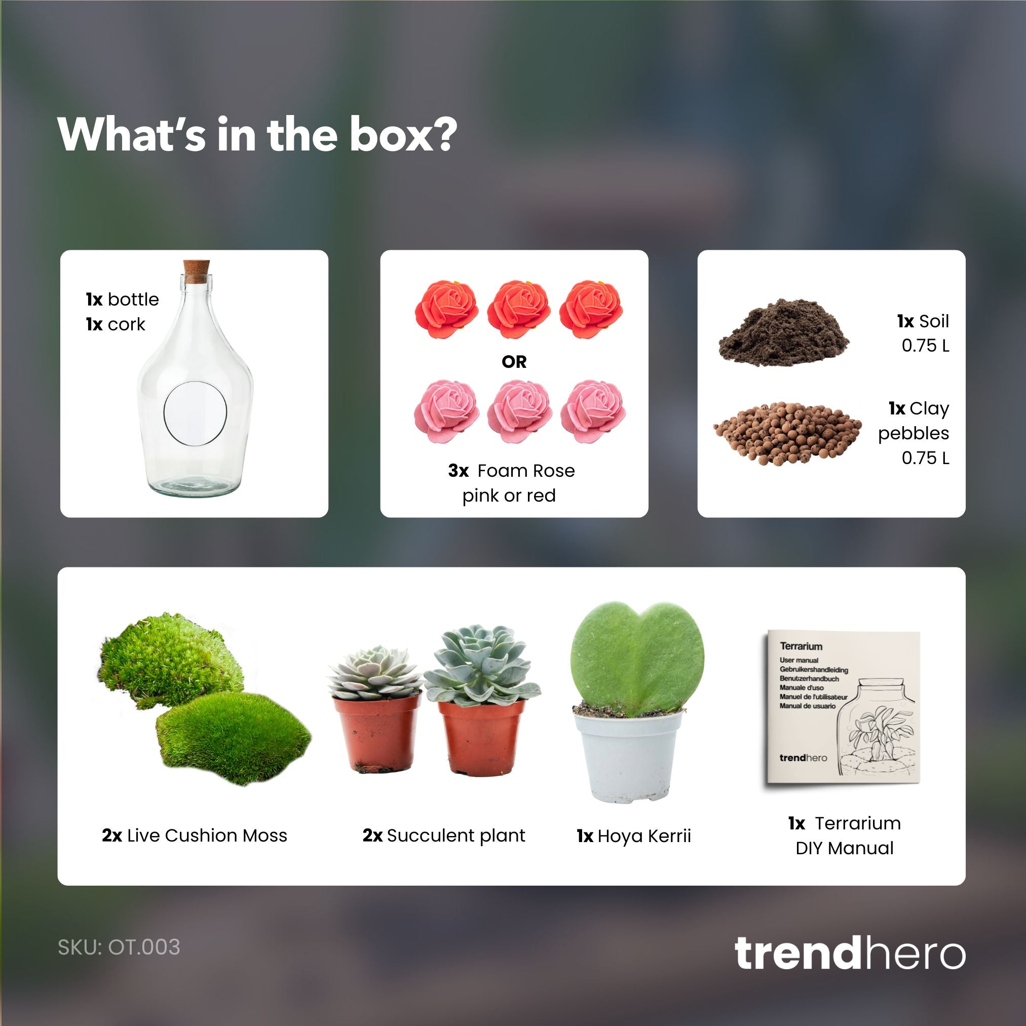 Love doesn’t have to be loud – sometimes, it fits perfectly in a bottle. Love in a Bottle is a handcrafted terrarium with a romantic twist. Through the circular front opening, you get a glimpse of a miniature love story: featuring a Hoya Kerrii (heart-shaped leaf), 2 succulents, Tillandsia moss, and three small decorative roses in red or pink (randomly selected). The glass bottle is sealed with a cork and filled with moss and soil – a stylish green gift that requires minimal care. Thanks to the semi-open system, this terrarium stays beautiful with very little effort.